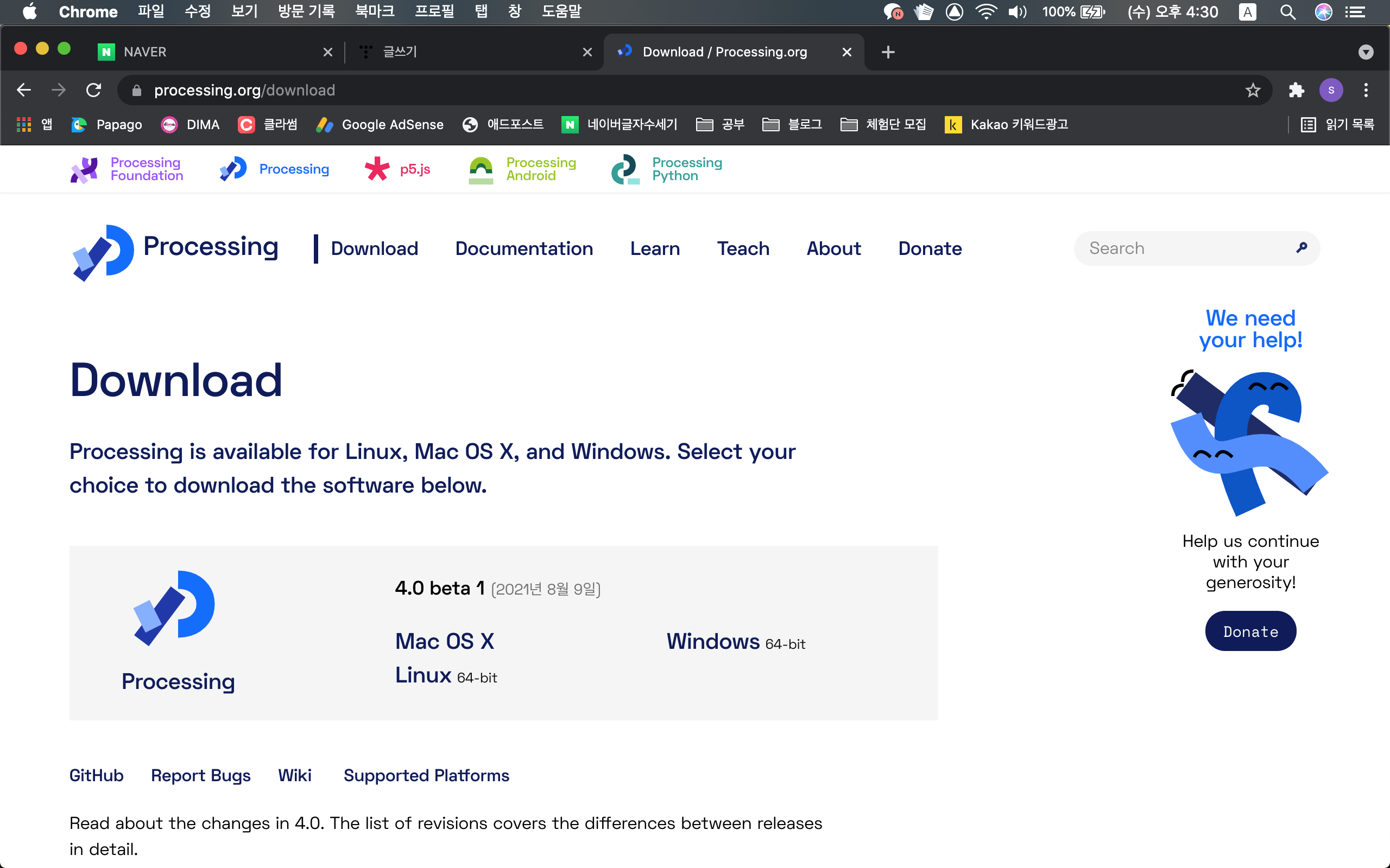 프로세싱 홈페이지에 접속해서 Download로 들어가 내 컴퓨터 운영체제에 맞는 녀석으로 다운로드한다.
