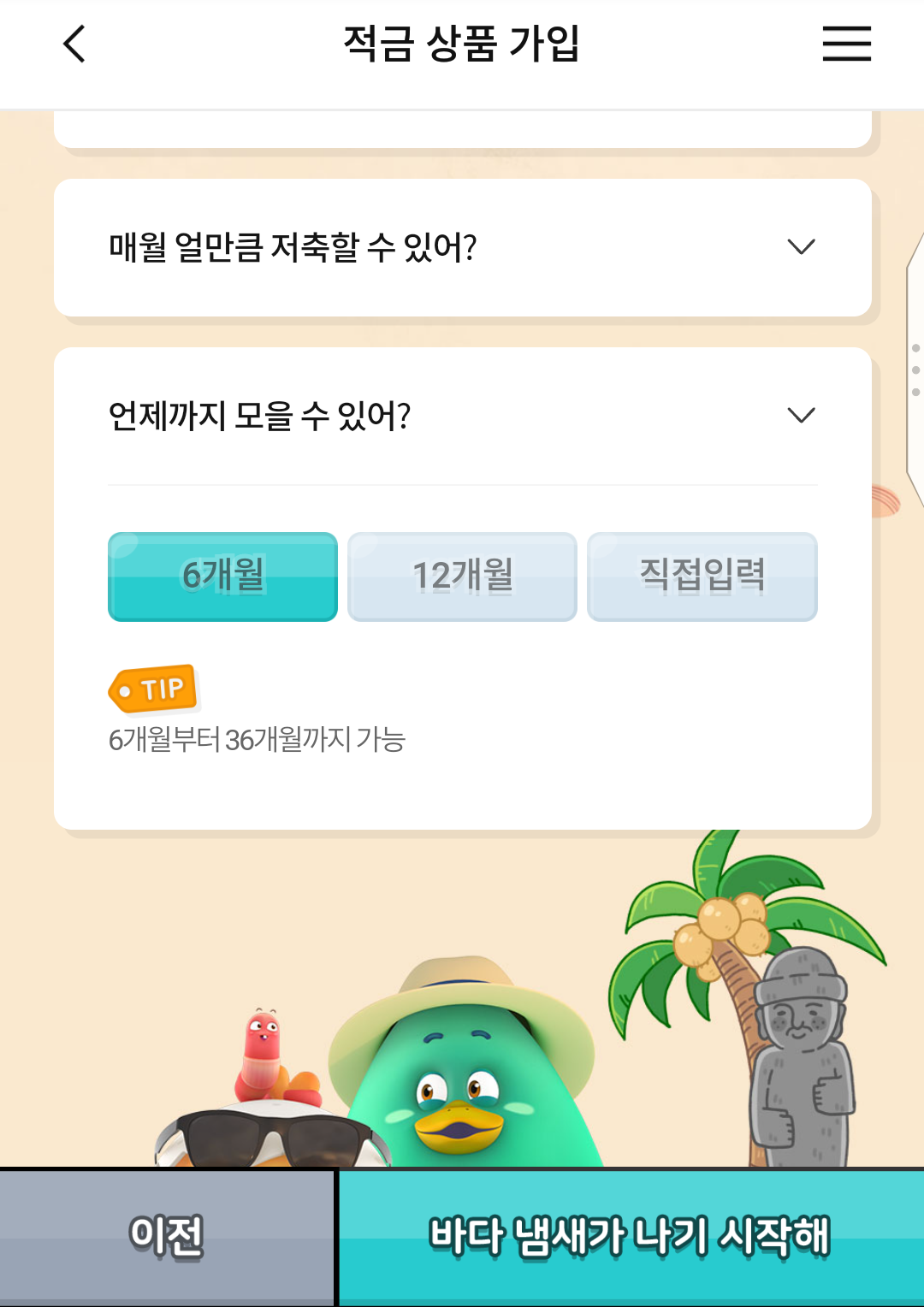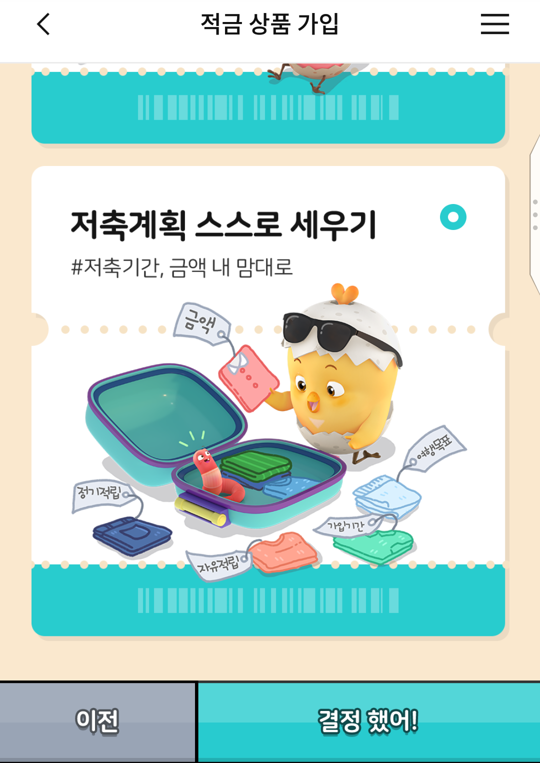 적금 상품 가입화면이 귀여운 게임처럼 흘러간다.