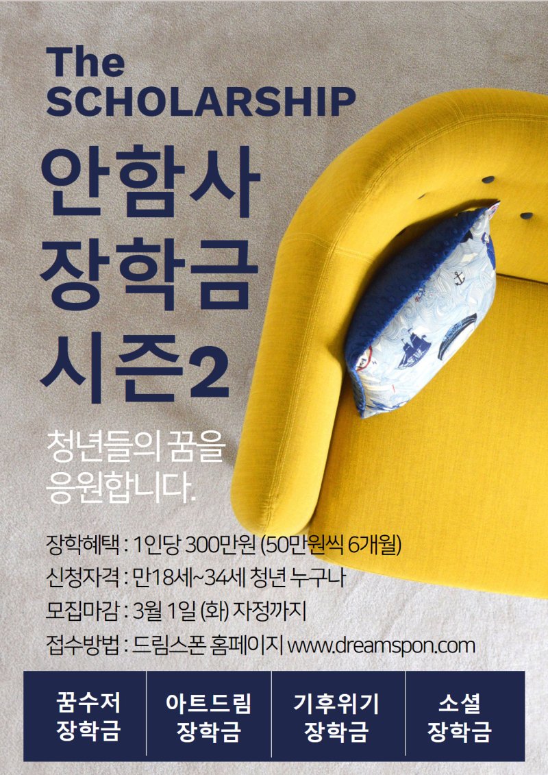 2. 아트드림 장학금 : 문화 / 예술 / 축제 / 전시 / 공연 / 음악 / 미술 / 공예 등 관련 활동하는 청년