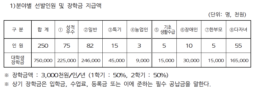 2) 일반장학생 : 경제적으로 어려운 가정의 학생을 선발