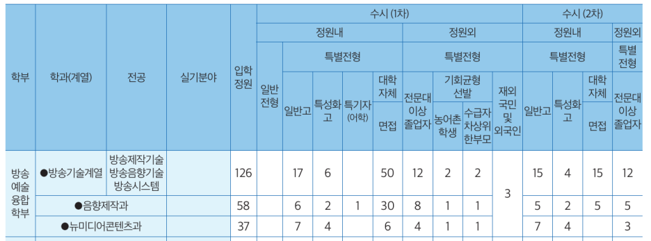 2021년 기준 동아방송예술대학교 음향제작과 수시, 정시 모집 정원입니다