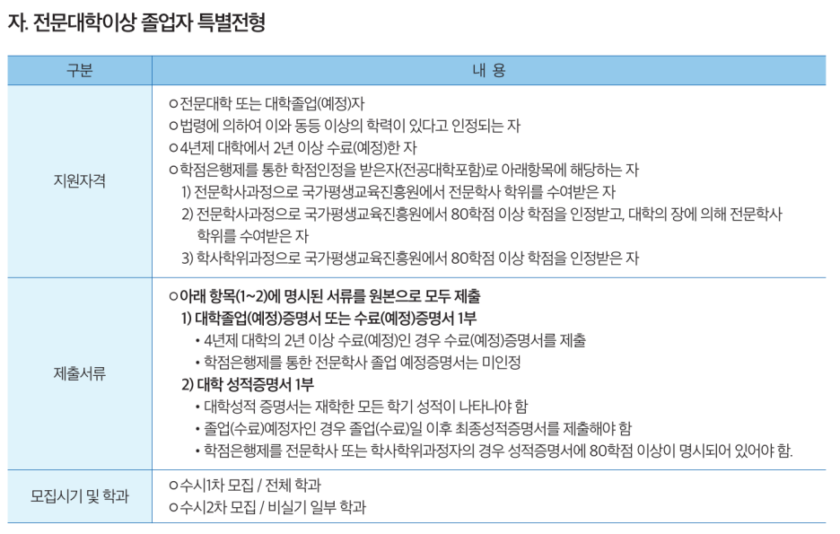 자세한 내용은 대학교 홈페이지 입학안내에서 확인 가능합니다. 저는 수시 1차 때 전문대 이상 졸업자 전형으로 원서 접수를 했습니다. 이 전형의 기준은 이 전 대학교의 성적만 봅니다. 다행히도 이 전 대학교에서 학점을 잘 받아놓은 덕분에 합격할 수 있었지만 혹시라도 떨어질까 봐 조마조마했었던 기억이 납니다. 보통 전문대 이상 졸업자 전형으로는 많은 인원이 원서 접수하지 않기 때문에 비교적 경쟁률이 덜합니다.