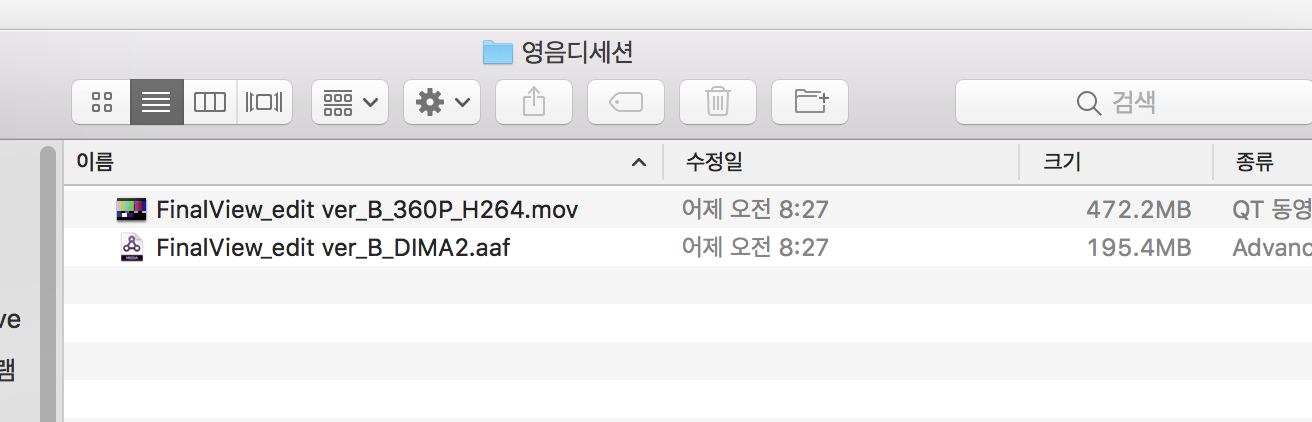 영상 음향 디자인 수업 때 실습으로 받은 파일이다. 이렇게 편집실에서 넘긴 AAF파일과 mov영상 파일 2개를 받는다.