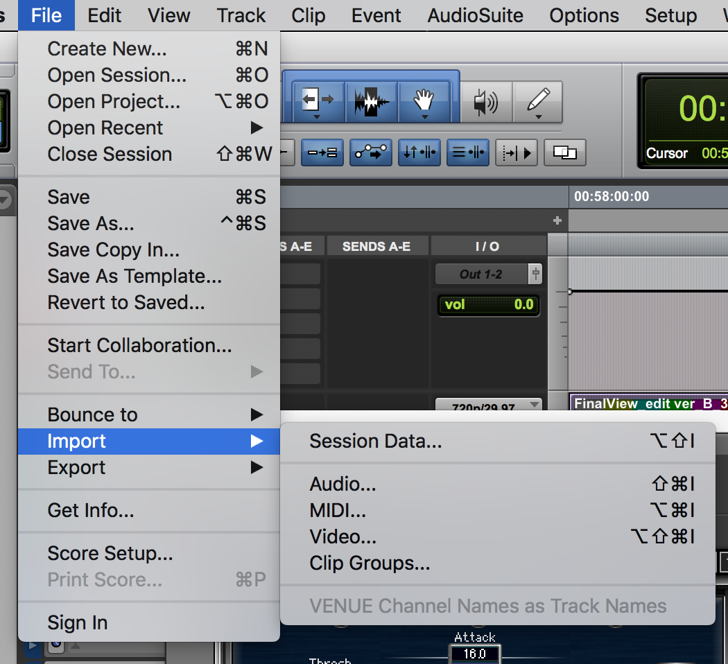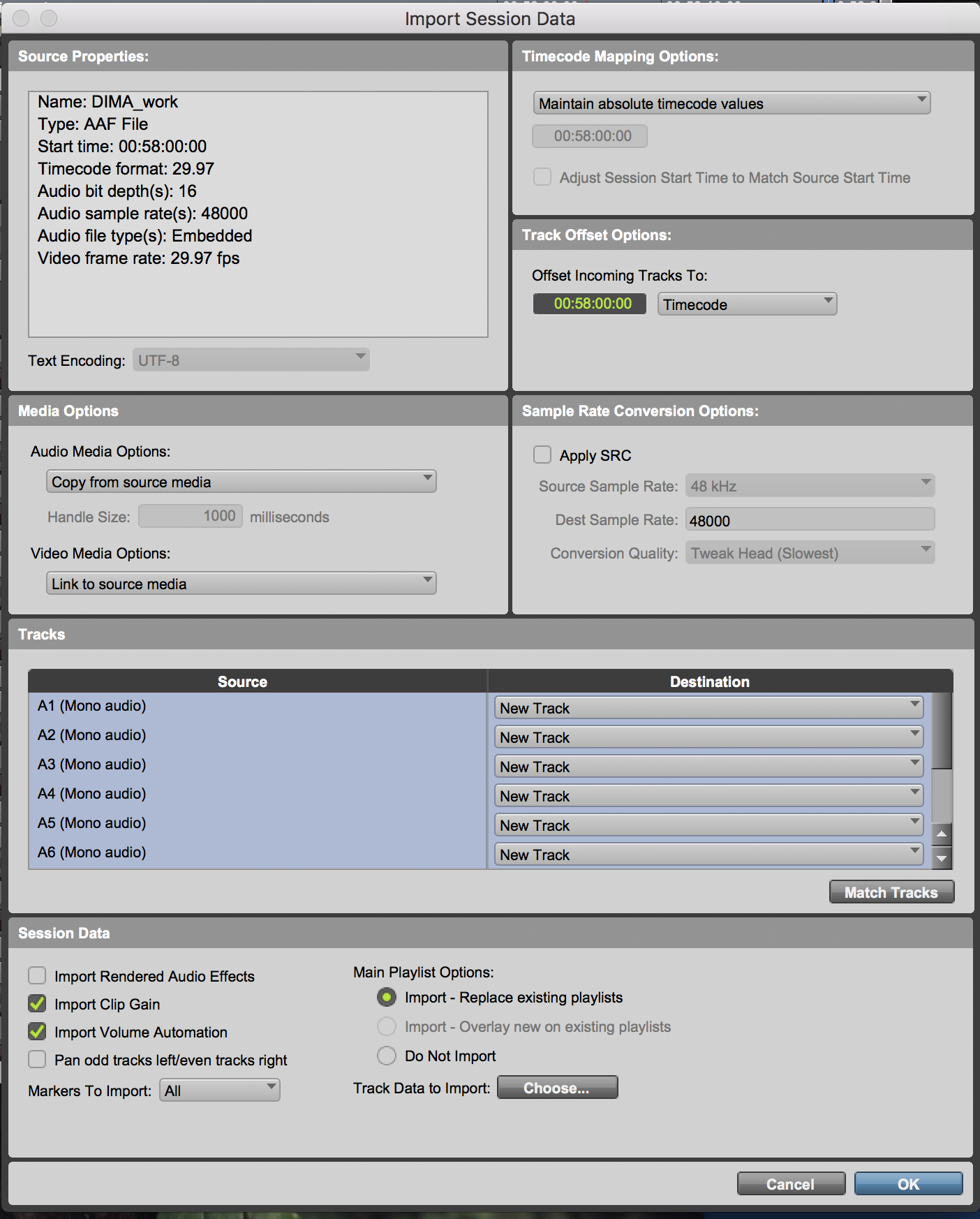 Import Sessin Data 창이 뜨는데 여기서 모든 트랙을 선택한다. 세션 데이터의 클립 게인과 볼륨 오토메이션을 같이 포함해서 불러오는데 이 볼륨을 그대로 쓰지는 않을 거지만 편집 과정에서 감독이 원하는 볼륨의 정도를 참고하기 위해 불러온다. 이 장면에서 편집 시 볼륨을 원래보다 더 올린 채로 넘어왔다면 감독이 이 장면을 더 강조하고 싶었구나 이런 의도를 파악하기 위함이다.