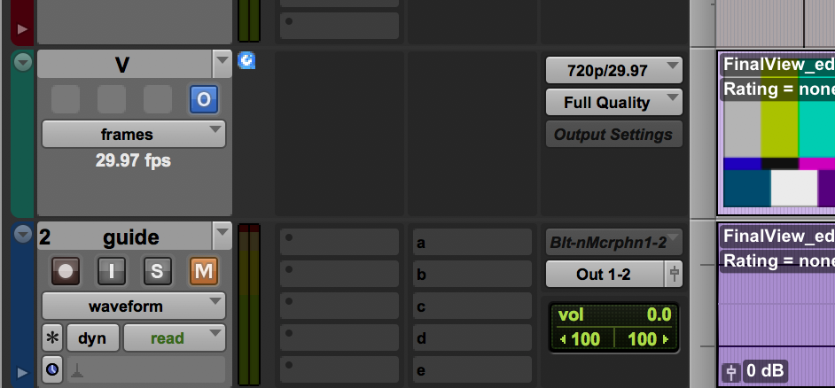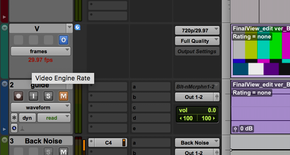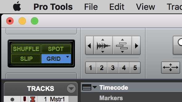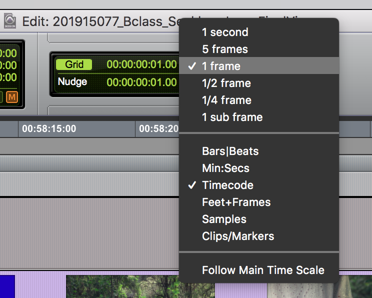 영상 음향 작업은 화면을 보면서 프레임 단위로 작업해야 하기 때문에 세션의 위에 있는 카운터 화면이 타임 코드로 설정되어 있는지 그리드와 넛지 단위가 1 frame으로 되어 있는지 확인해야 한다. 편집 모드도 일반 음악 편집할 때와 달리 GRID 모드로 설정해둔다. 이 설정이면 넛지가 한 칸씩 움직일 때마다 한 프레임씩 움직이게 되는 것이다.