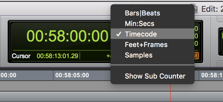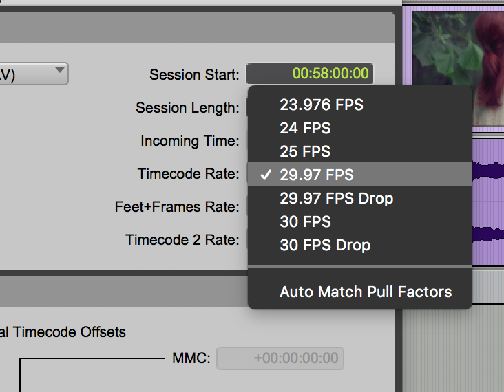 Session Setup창이 뜬다. 여기서 Timecode Rate를 선택해보면 위와 같이 여러 종류의 타임코드 레이트들이 뜨는데 여기서 영상과 같은 걸로 설정한다. 29.97 FPS Drop은 잘 안 쓴다고 한다. 이렇게 영상과 세션의 설정을 같게 해 주면 빨간색으로 떴던 표시가 하얀색 표시로 정상적으로 바뀌게 된다.