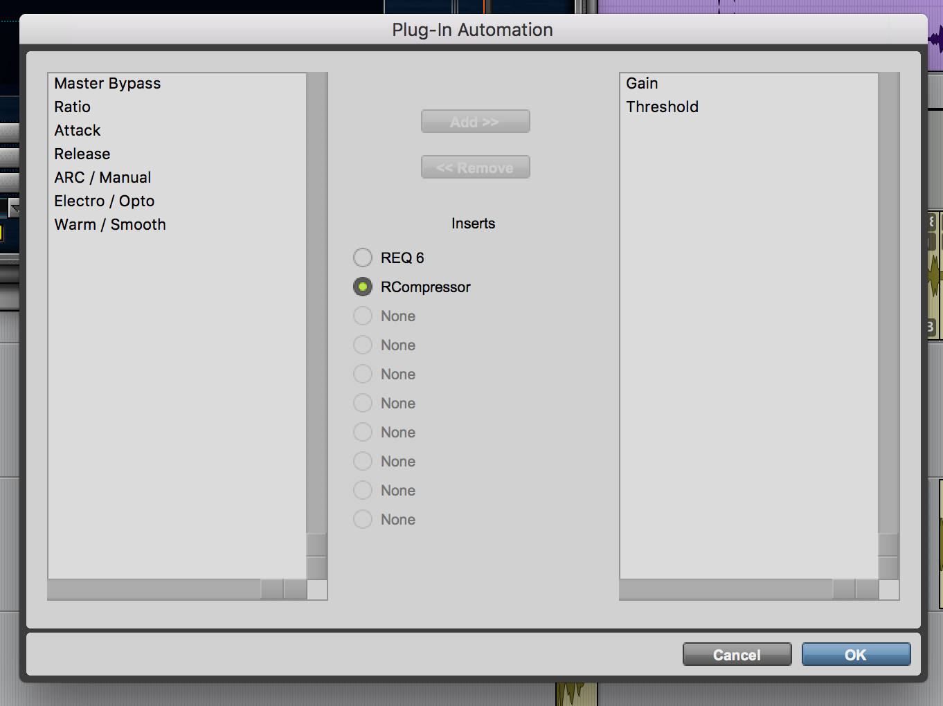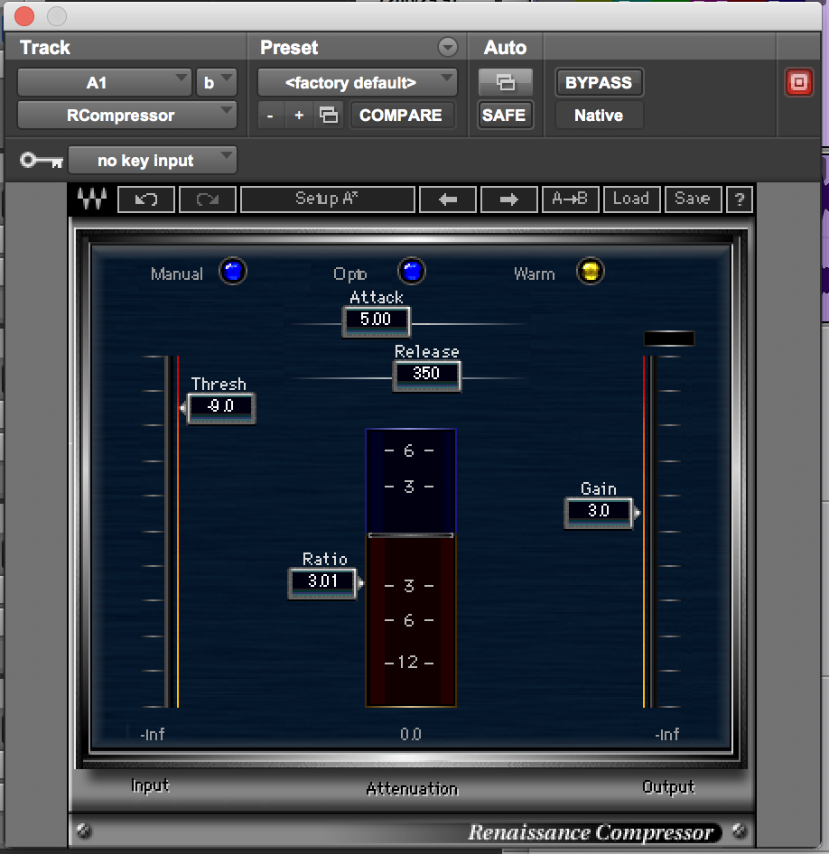 동시녹음의 대사가 자연스럽게 하기 위한 컴프레서 세팅이다. 아날로그 컴프레서처럼 반응속도가 조금 둔하게 걸려서 자연스럽게 하기 위해 Manual 모드와 Opto 모드로 변경한다. 어택은 5ms 정도, 릴리즈는 350~400ms 정도로 설정한다