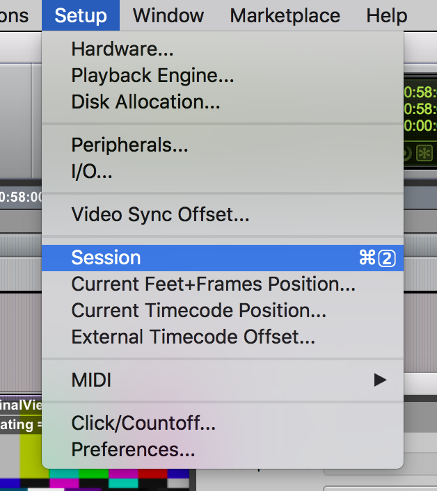 이제 작업을 시작하기 위해 세션에 영상파일을 불러왔는데 frames이 빨간색 글씨로 표시될 때가 있다. 이 때는 프로툴 세션과 영상이 서로 설정이 뭔가 안 맞다는 걸 의미한다. 영상의 프레임을 바꿀 수는 없으니 프로툴즈의 세션 환경을 바꾸도록 하자.