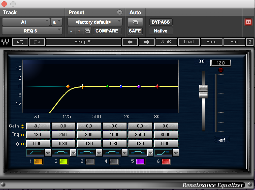 대사 트랙에 거는 REQ6 플러그인의 주파수 대역대 기본 세팅이다. 동시녹음의 불필요한 저음들을 낮추기 위해 low cut은 기본으로 설정한다.
