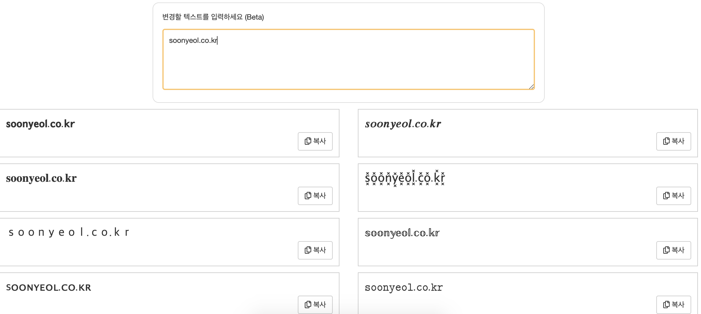 밑에 다양한 폰트들이 나왔는데요 이 중에서 마음에 드는 폰트를 골라서 복사를 누르시면 됩니다.